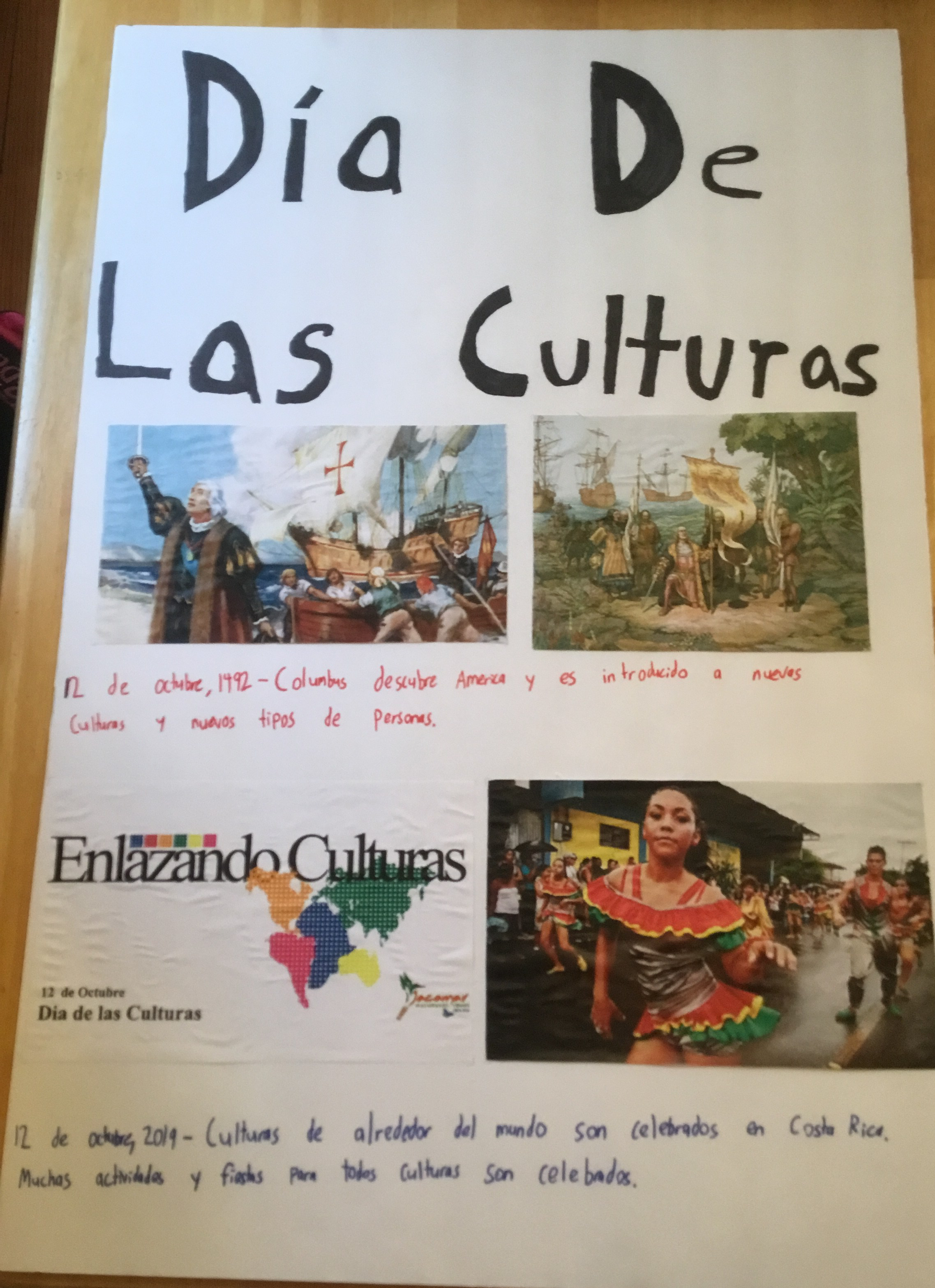 El Día de la Culturas es celebrando en 12 de octubre. Eso celebrando en Costa Rica porque es conmemorado el descubrimiento de America por Christopher Columbus. También se puede llamar el Día Conocer Nuevas Culturas. El nombre estaba cambiado porque, el personas de Costa Rica tiene un desacuerdo sobre real sentido. Es different entre Columbas Day porque Costa Rica celebra le cultura de Español. Muchos tipos las vestidos y las canciones y otras actividades en eso día.